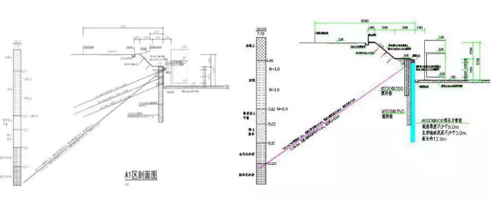 该方案虽然合理,但体系复杂、施工步骤多,工效低。专家组将复合土钉墙支护方案调整为PCMW工法+一道预应力锚索的支护方案,在搅拌桩内插钢管桩调整为内插PHC管桩,通过增大围护结构的刚度来减少注浆锚管,从而简化了施工工序,并保障了施工安全。