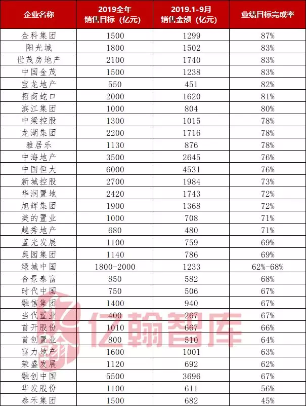 图表:2019年1-9月典型房企销售业绩目标完成率