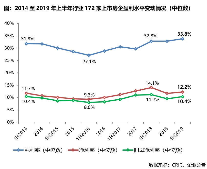 随着行业增速放缓、集中度上升、规模房企竞争加剧,企业在盈利、融资、周转等方面都出现了一些变化。复杂的市场环境对企业运营能力的要求也在不断增加。1)房企整体盈利水平进入平稳期,中小规模房企盈利能力承压2019年上半年,受行业整体销售增速放缓影响,上市房企整体结算收入和利润规模在保持增长的同时,增速较2018年明显放缓。同时,行业整体盈利能力也逐步进入到平稳期。截止上半年末,172家上市房企净利率和归母净利率的中位数为12.2%和10.4%,分别较2018年末提升0.5和0.9个百分点。我们认为,虽然短期内受益于行业集中度上升及收并购红利,规模房企整体的利润率尚稳定在较高水平。但在目前政策调控常态化、行业增速放缓、房企利润空间持续受到挤压的市场周期下,企业要保持目前的盈利水平仍面临一定的客观压力。特别是对于中小规模房企而言,在行业竞争格局加剧、集中度提升的背景下,如何平衡规模增长与增长质量,提升精细化经营的管理水平对经营者提出了更高的要求。